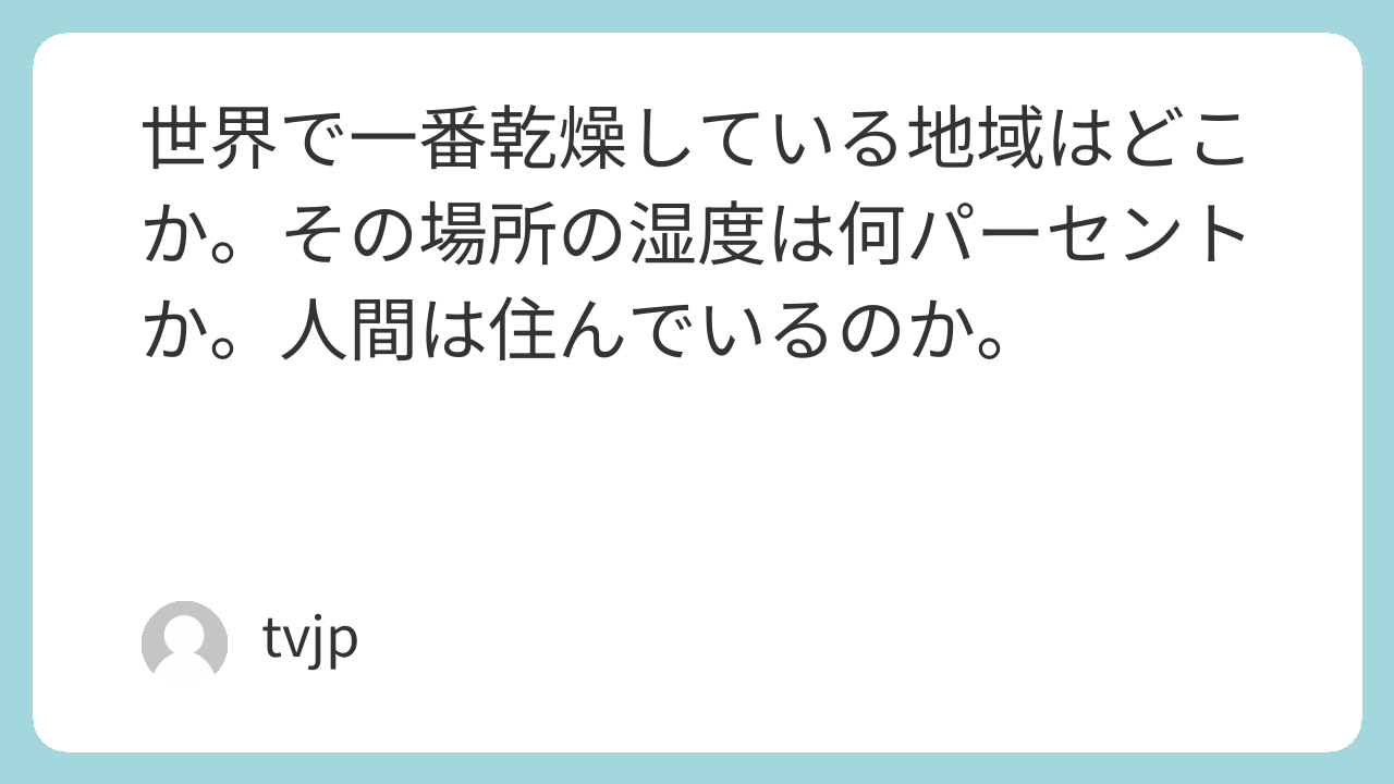• 非極地で最も乾燥している代表は チリ・アタカマ砂漠。空気の湿度は約10%、特定の地点ではさらに低い湿度値(大気17.3%、土壌14%)が観測されています。